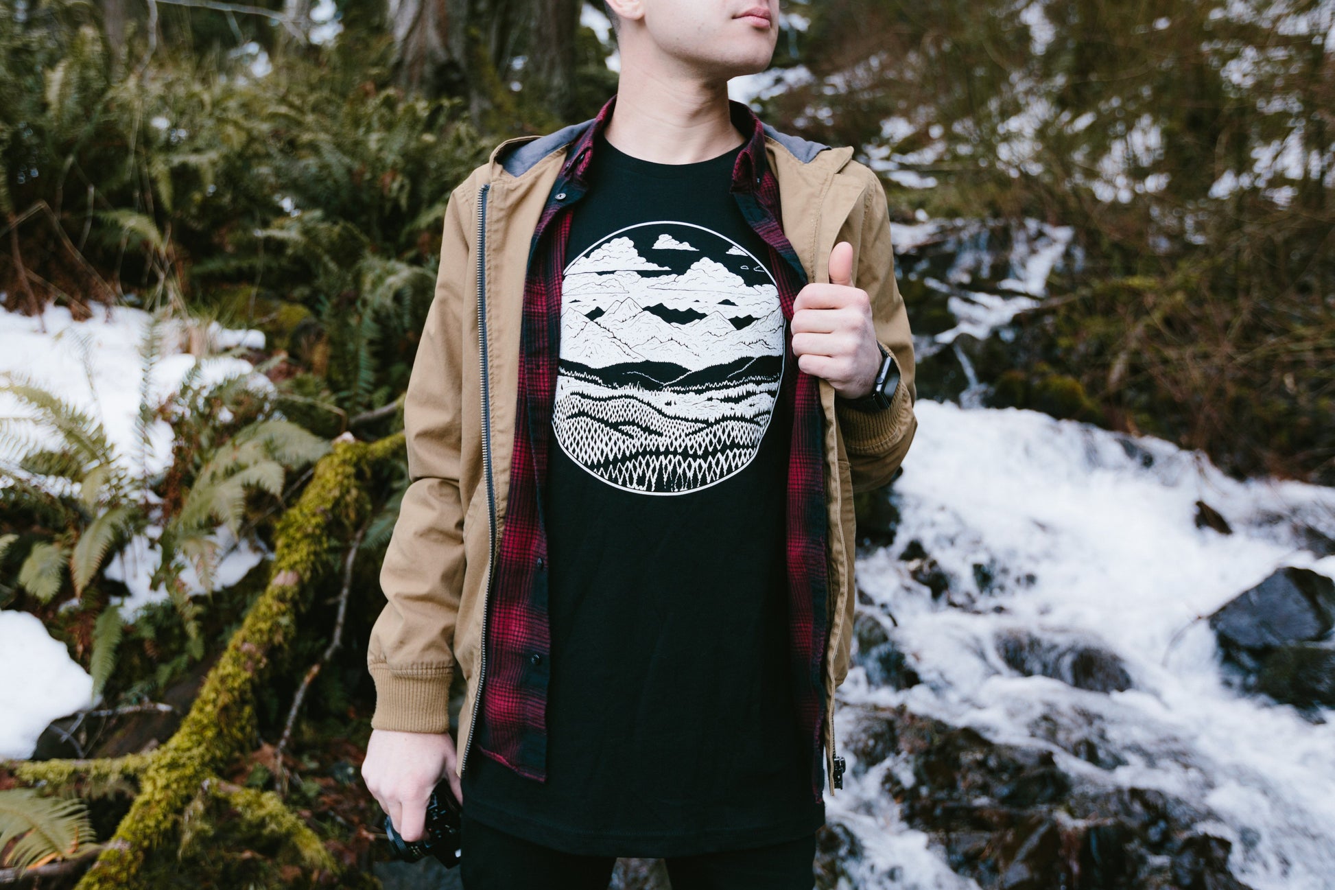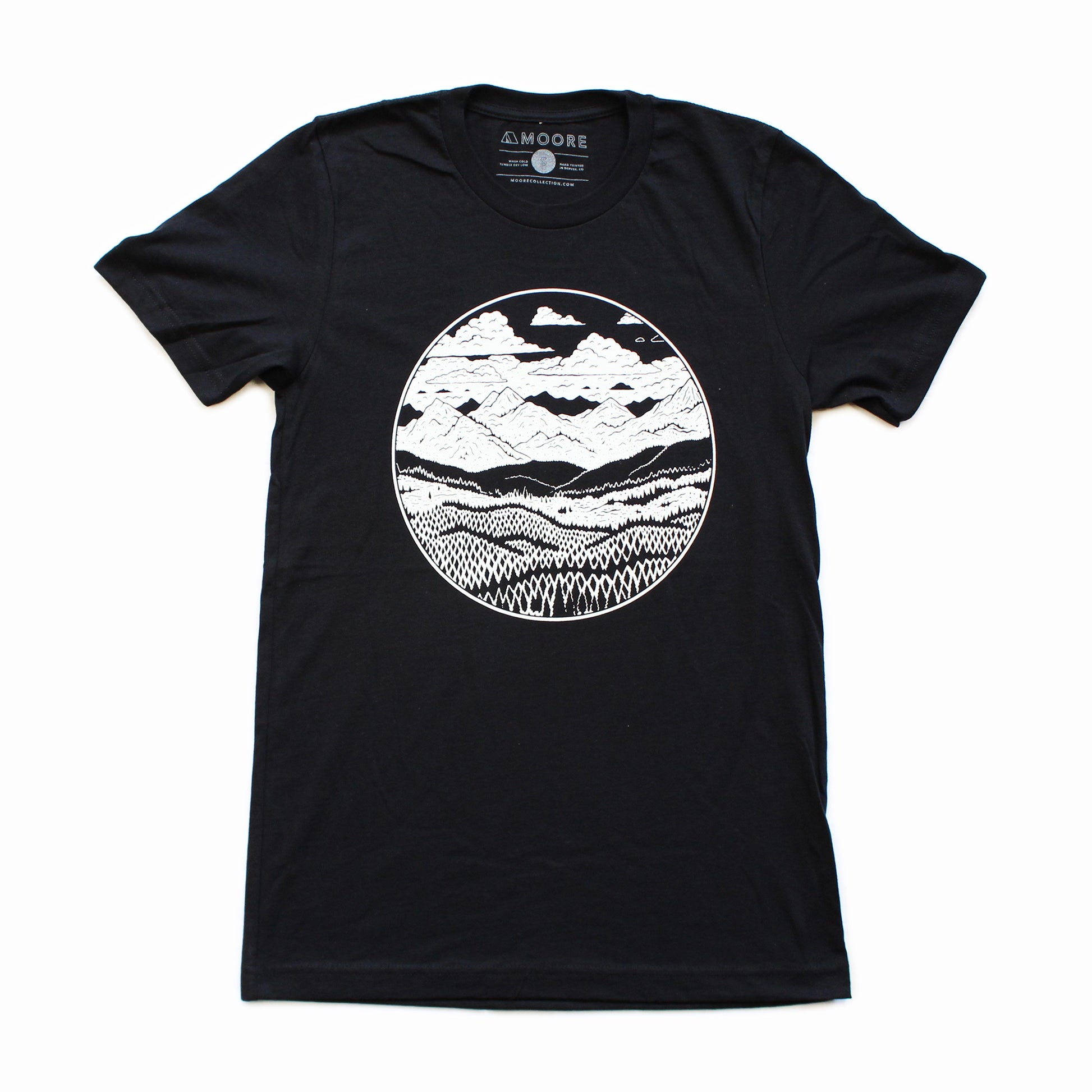 Our Mountain Range Tee in black is a screen printed t shirt with white water-based ink. With a retail fit, this incredibly soft t shirt is made out of 100% ringspun cotton. Our soft mens t shirts are unisex in wear.